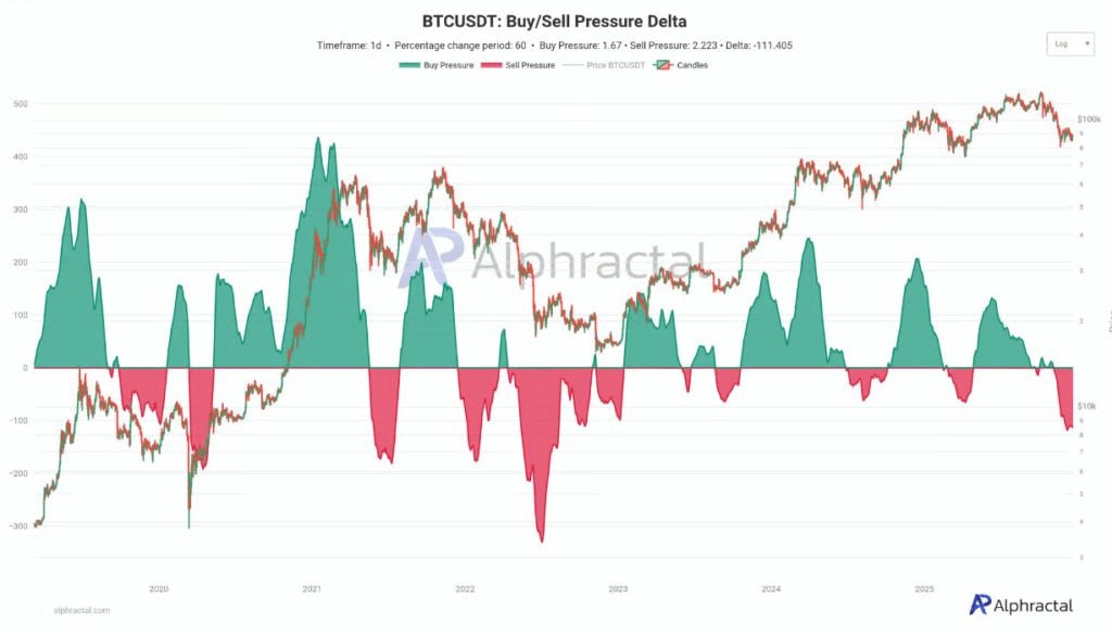 According to data from Alphractal, Bitcoin is facing its strongest selling pressure in the market since 2022. The chart below shows the data crossover, indicating a delta between buying and selling pressure on BTC. A deeper analysis reveals a clear signal: selling pressure has returned with an intensity similar to that of the bottom of the last bear market.