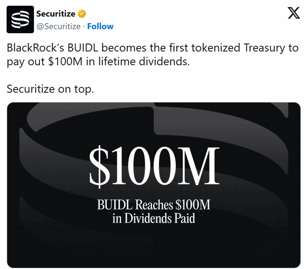Institutional finance just reached a new milestone on the blockchain. The BlackRock tokenized BUIDL fund has officially distributed $100M in total dividends to its holders. This level of success shows that tokenized securities are no longer just a theory.
