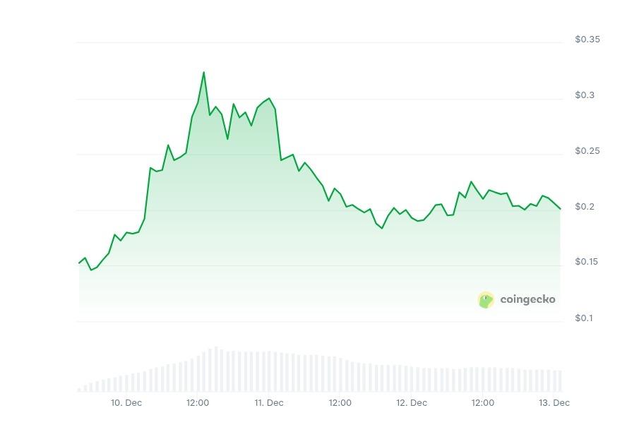 The listing was part of the factors that spurred a huge rally for the altcoin. As of December 12th, it was trading at $0.203 with a weekly gain of 80.93%. Coincodex forecasts a price drop to $0.1552 in the coming month.