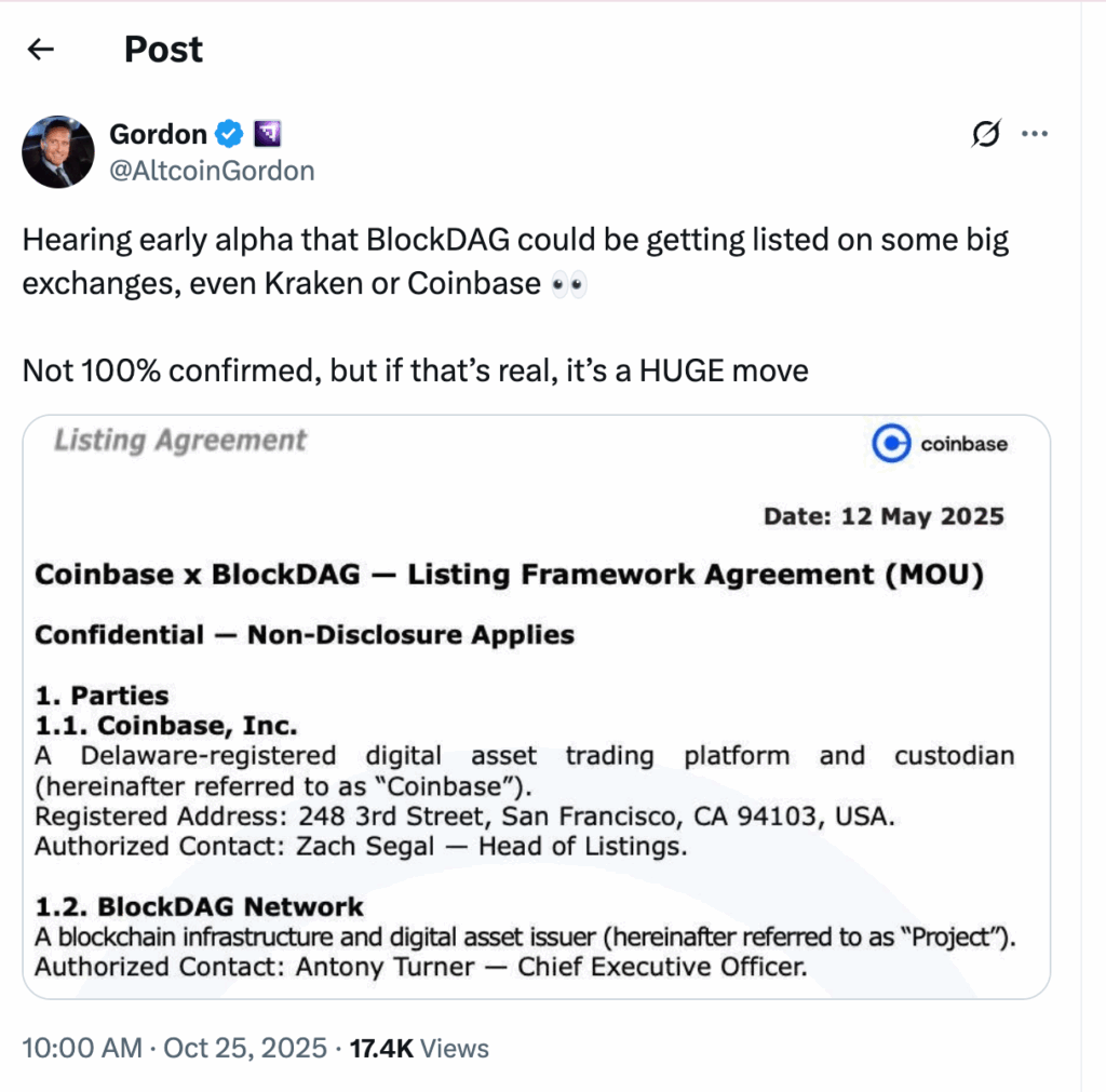 If authentic, these documents suggest BlockDAG is moving rapidly toward Tier-1 exposure, far ahead of many early-stage competitors. That is why several market watchers now view BDAG as the top crypto buy of 2025.