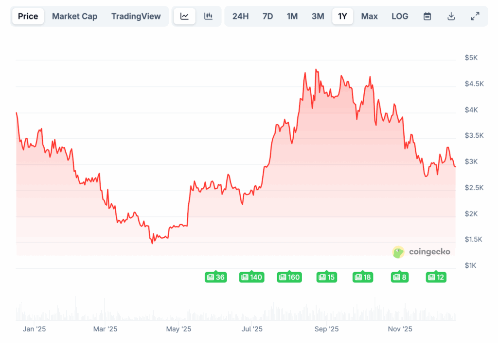 Recent whale accumulation of ETH is a sign of optimism. BlackRock transferred $140M worth of ETH into Coinbase Prime. Analysts see this as a sign of strong institutional trust. Analysts believe that a market turnaround in early 2026 could lead to ETH doubling from the current level of $2,950: