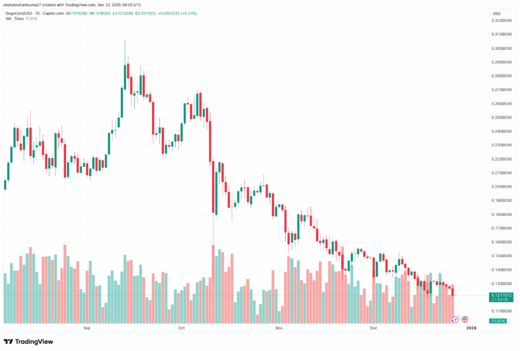 Dogecoin has fallen 1% over the past seven days as of December 26th, according to the market. Dogecoin technical analysis shows the price trading below key moving averages, specifically the 50-day SMA of $0.1482 and the 200-day SMA of $0.1967.