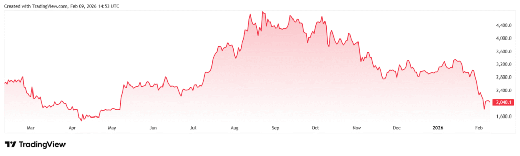 As of February 2026, Ethereum is trading in a fragile range near $2,060, reflecting a sharp correction from its 2025 all-time high of nearly $4,950. While its market capitalization remains massive at approximately $250 billion, this high valuation has become a double-edged sword.