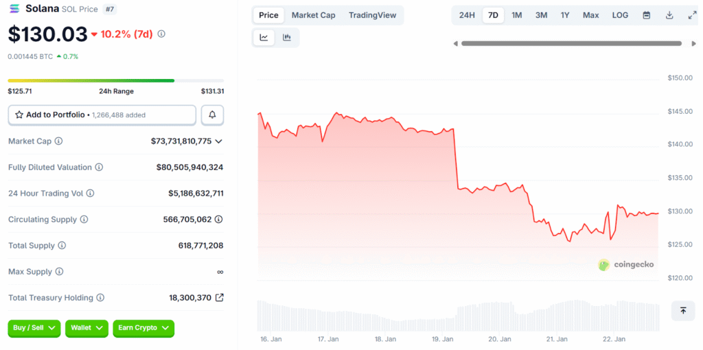 By Jan 22, the Solana price entered a narrower range and exchanged around $130.15, with price movement staying moderate compared to the previous decline. Solana’s trading activity remained elevated at roughly $5.2B–$5.3B in 24 hours, demonstrating that interest has not diminished. Critical levels are evident: support exists near $124.7–$125.8, while resistance is concentrated around $132–$134.6. A decisive break beyond that level would transform sentiment rapidly.
