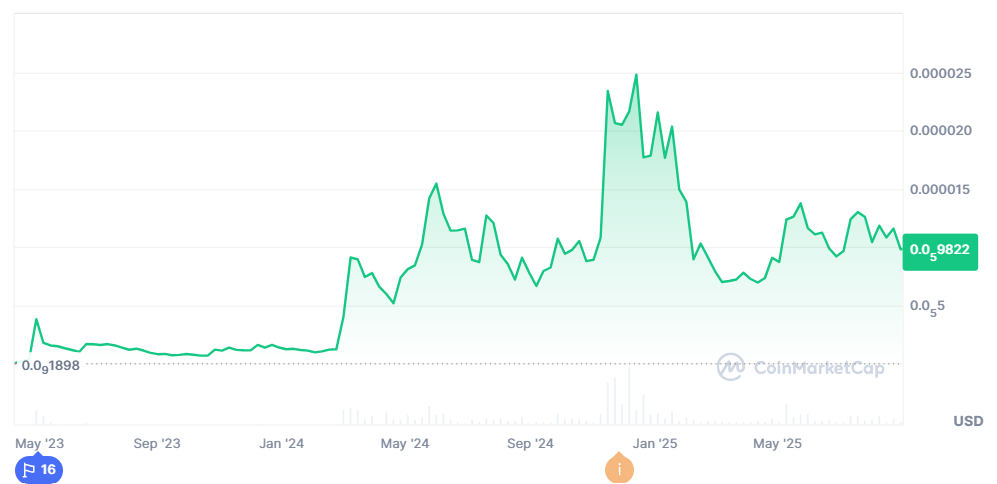 Currently, Pepe trades at $0.000009822 with a market capitalization of $4.13 billion and a daily trading volume of $327 million. While 24-hour performance shows a modest 0.08% gain, the past week saw a 9.5% drop, and the past month a 7.3% pullback. Over the past year, Pepe has still delivered a 29.37% increase, but its towering achievement remains its lifetime gain of over 92 million percent since its all-time low of $0.00000000001063.