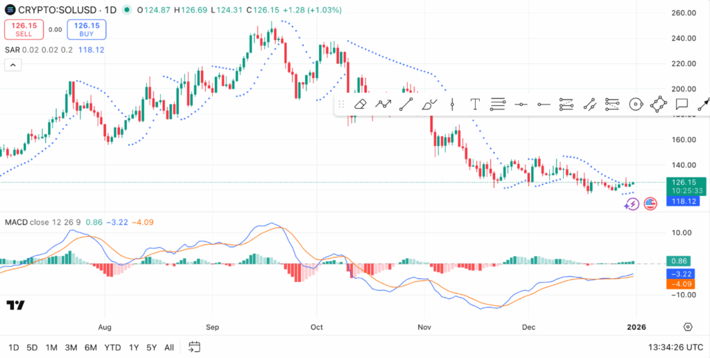 On December 31st, Solana was priced at around $123. The current Solana price forecast suggests that the token must defend the $118 support level to maintain its positive momentum, and the clear ceiling near $129 shows the other end of its current range.