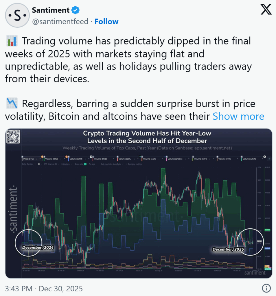 The final days of the year have brought a big lull to the crypto space. Reports show that social media discussions regarding crypto and trading volumes themselves have fallen sharply as 2025 ends. This lack of liquidity often makes markets more vulnerable to sharp moves, as smaller orders can have a larger impact on price action.