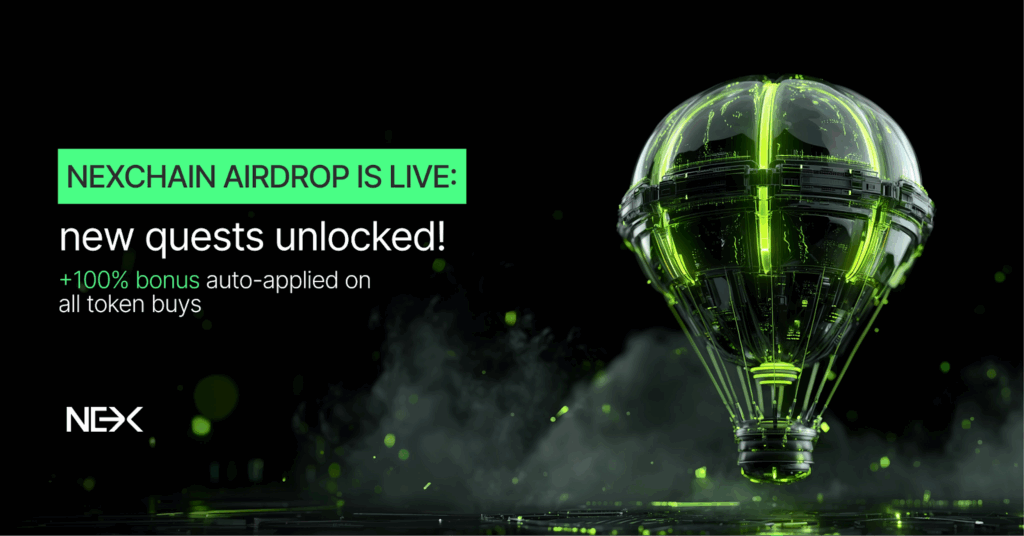 Nexchain’s airdrop continues to expand, offering even more ways to earn ahead of the mainnet launch. This week features two key events: the Flash Quest, where you can earn an extra +100 points by buying NEX in the next 48 hours, and the Double Presale Points Week, which runs from Oct 16–23 and doubles your points for every buy quest completed.